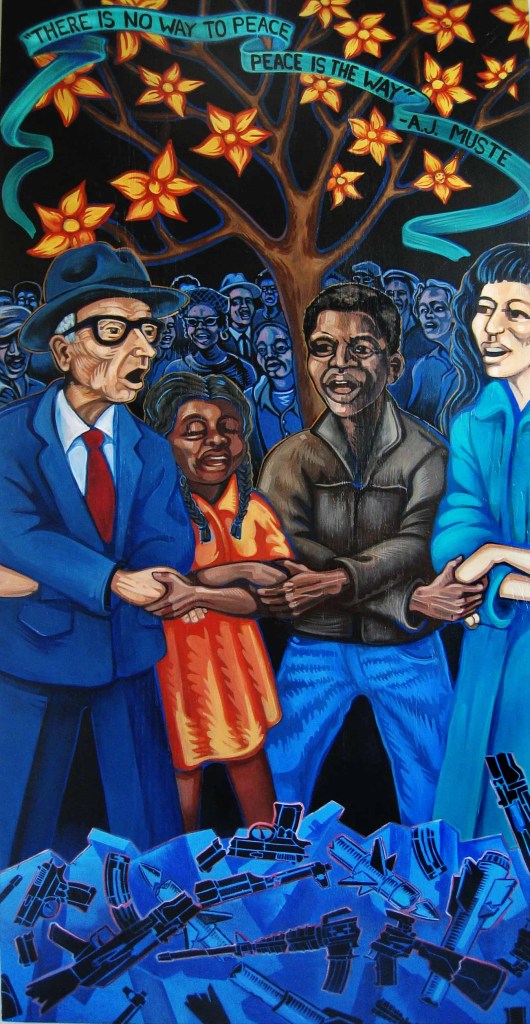 A.J. Muste (pictured here in a mural on the War Resisters League building in Manhattan) used to stand outside the White House at night holding a candle in the dark to protest what the government was doing. Seeing this night after night, a reporter asked him, “Do you really think you’re going to change the policies of this country by standing out here alone with a candle?” Muste replied, “Oh, I don’t do this to change the country. I do this so the country won’t change me.”